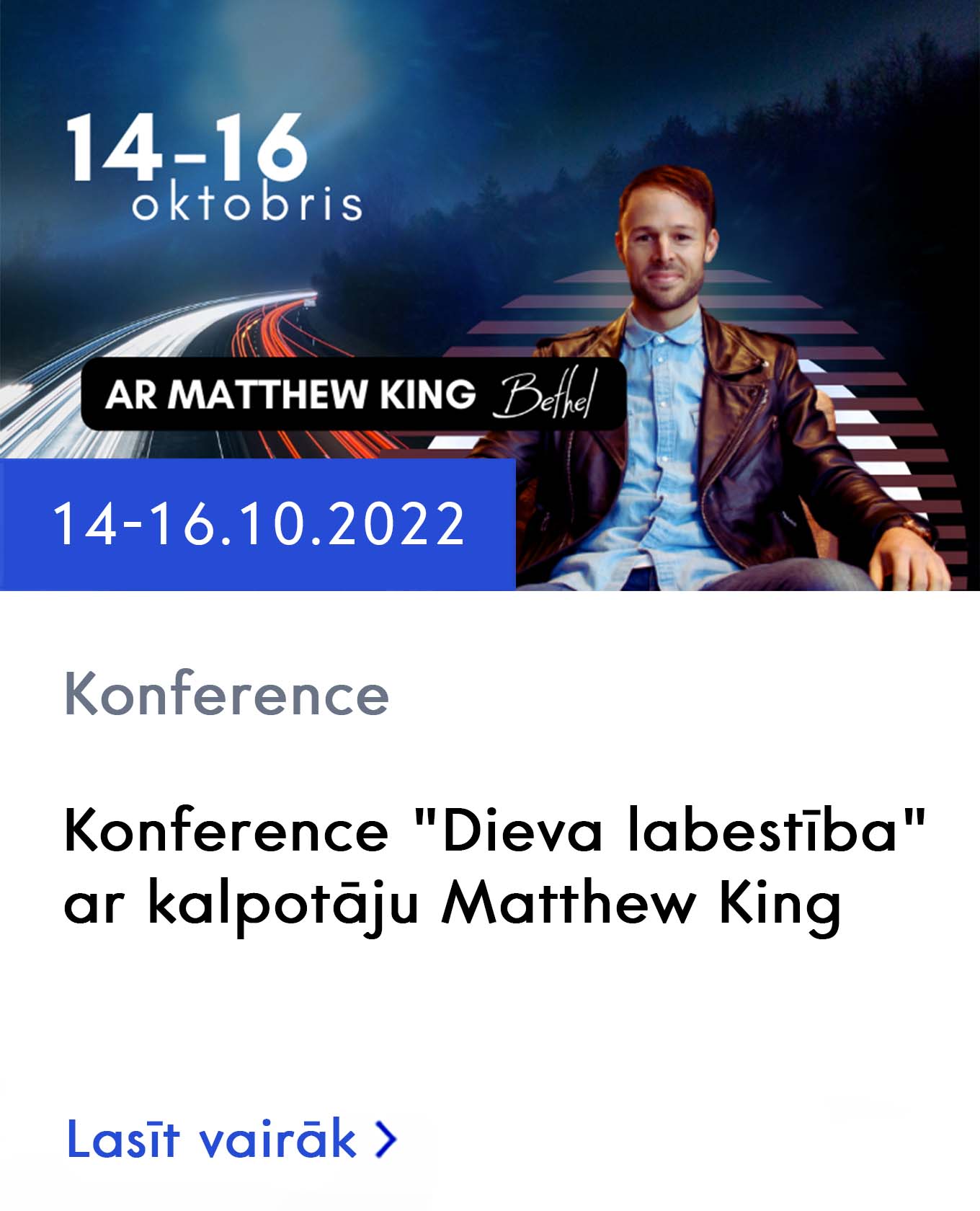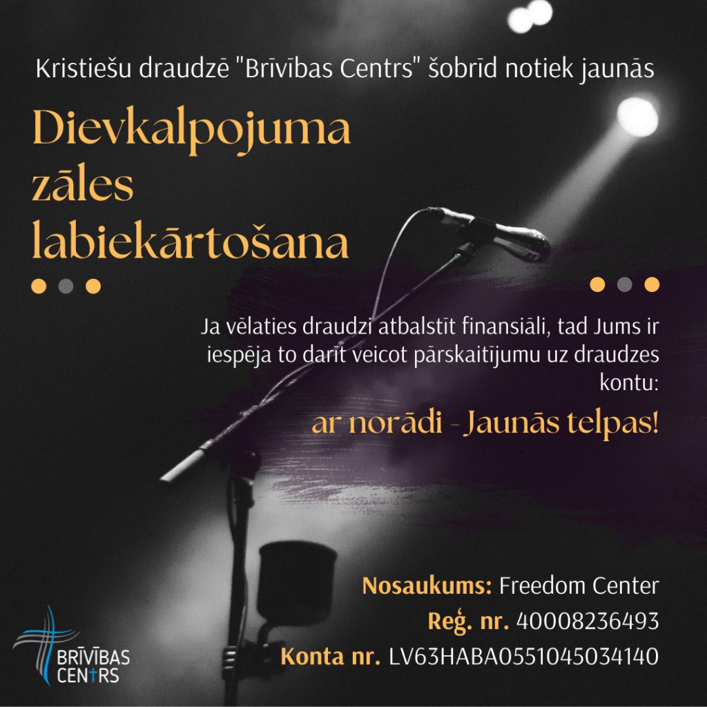 Kristiešu draudze “Brīvības centrs” visus mīļi aicina uz konferenci “Dieva labestība” ar kalpotāju Matthew King no draudzes “Bētele”, ASV! Ja vēlies piedzīvot Dieva klātbūtni, esi izslāpis pēc Viņa, tad nāc, jo mēs ticam, ka Dievs Tēvs ļoti īpaši izlies Savu labestību, godību un mīlestību uz mums šajās dienās! Konference notiks no 14-16.oktobrim Rīgā, Lienes ielā …