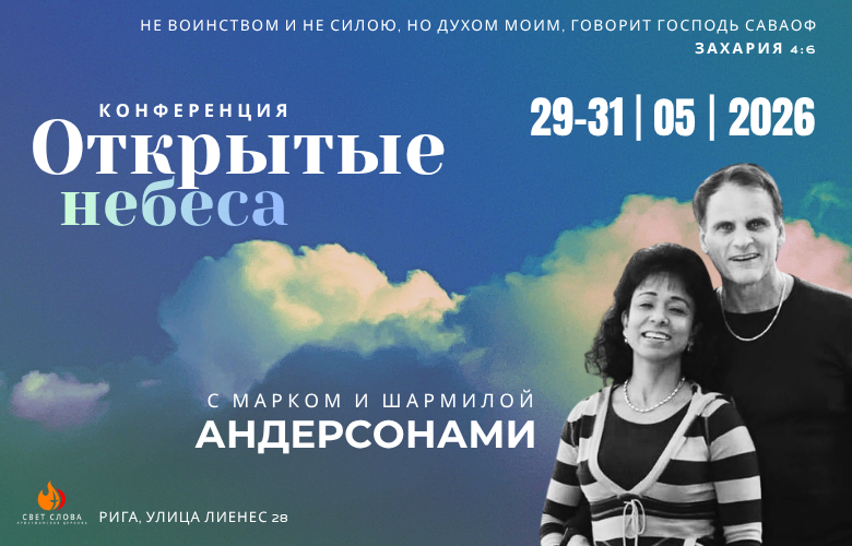 Приглашаем всех на конференцию «Открытые Небеса» с Марком и Шармилой Андерсон, которая пройдет 29–31.05.2026 в церкви «Свет Слова», Рига, улица Лиенес 28.